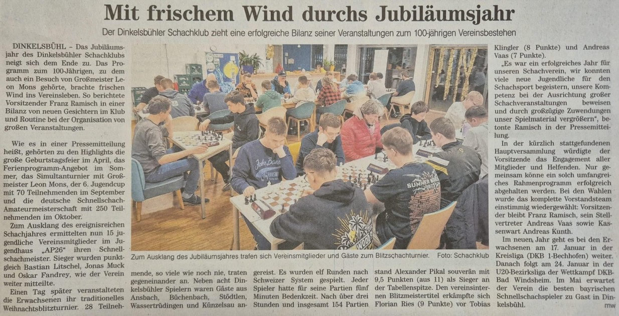 Highlight der Gegenwart (DSSAM / DSEM / DFSEM 2023) Im Herbst 2023 war Dinkelsbühl Gastgeber der Deutschen Schnellschach- Meisterschaften mit vielen GM / IM und FM - Sieger wurde GM Leon Mons In den drei Turnieren nahmen insgesamt über 350 Schachspieler teil |